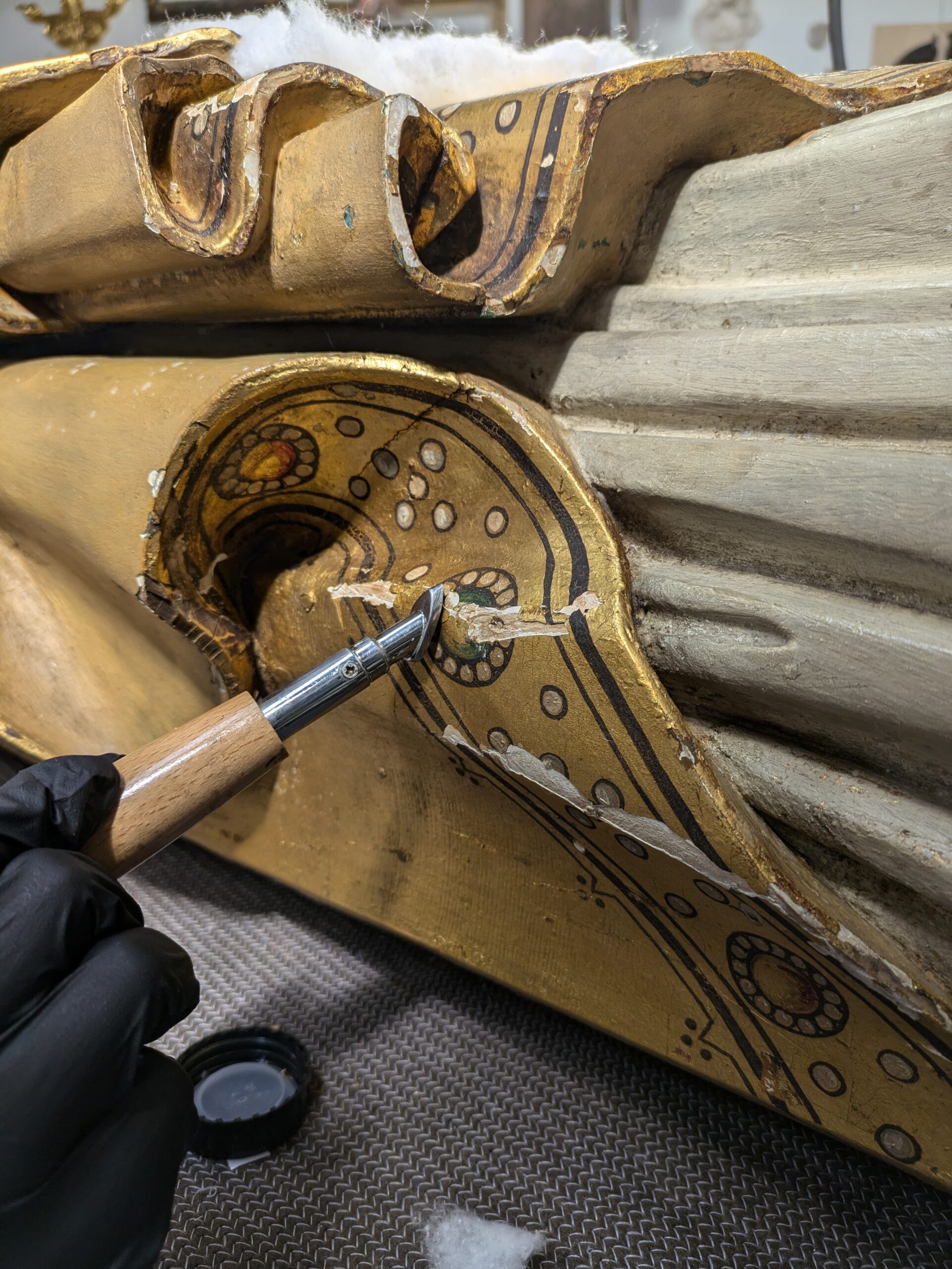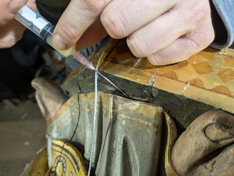 Het houten beeld uit de negentiende eeuw vertoonde diverse scheuren. Ook de verf begon op verschillende plaatsen los te laten of was er al van afgebladderd. Verder was het beeld op sommige stukken beschimmeld en flink vuil. Het doel van de restauratie was om het beeld schoon te maken en te stabiliseren, zodat verdere schade in de toekomst voorkomen kan worden.